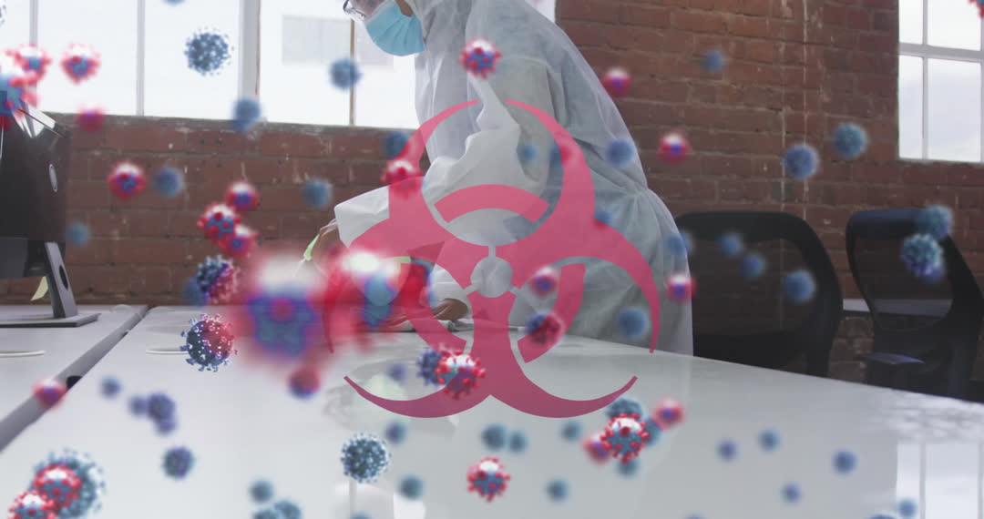 Healthcare worker wearing face mask and protective suit disinfects an office table amidst animated COVID-19 virus particles. Symbol of biohazard overlaid represents the dangers and urgency of combating pandemic threats. This depiction reflects the critical measures implemented during global healthcare crises, emphasizing disinfection and hygiene. The visuals also symbolize the battle against invisible threats. Useful for content focused on pandemic response, health and safety protocols, or workplace hygiene measures.