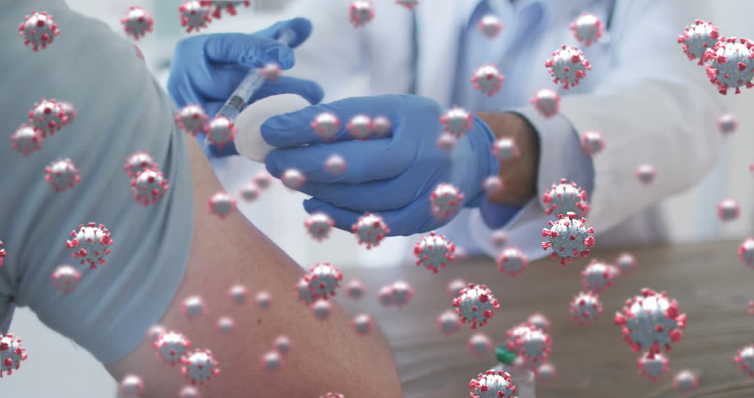 Visual depicting a healthcare worker administering a vaccine against the backdrop of COVID-19 viruses Commonly used for topics related to public health awareness, vaccination campaigns, COVID-19 pandemic responses, medical care practices, infection prevention, immune defense, healthcare themes and digital content for news articles or health bulletins.
