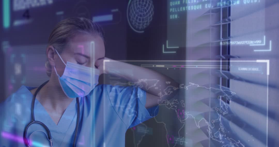 Healthcare worker stands in front of digital screens displaying global tracking data. They show signs of fatigue, highlighting demanding nature of medical profession and technological integration. Futuristic overlays suggest an environment focused on advanced medical analysis. This could be used to depict modern healthcare challenges, technological advancements in medicine, or the impact of technology on everyday roles in healthcare.