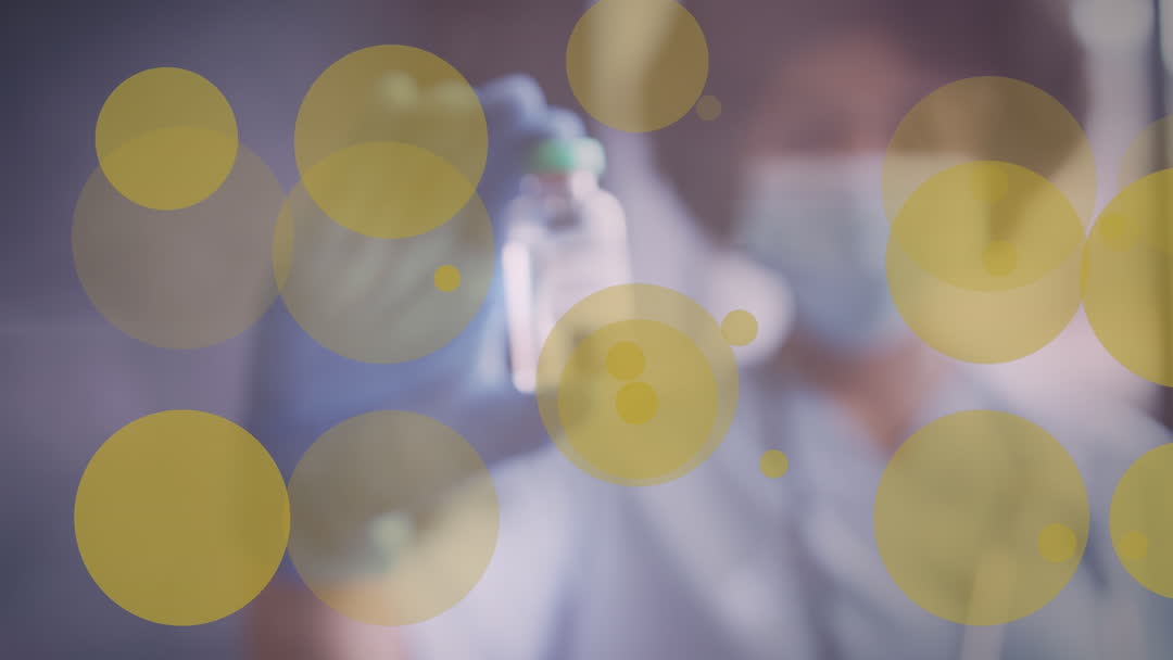 Healthcare professional holding vaccine vial with colorful bokeh bubbles overlay signifies innovation and medical safety in the digital age. Use in medical content, technology partnerships, or innovative health solution promotions.