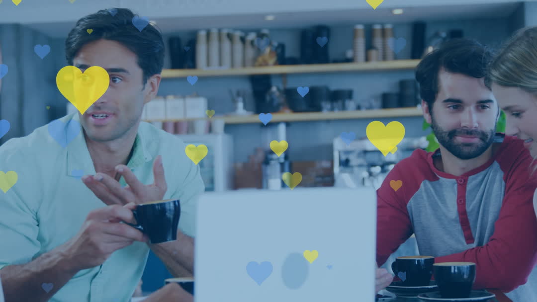 Group of diverse professionals in casual attire engaging in discussion at a coffee shop. Animated hearts overlayed add a whimsical, engaging element. Useful for illustrations related to teamwork, collaboration, or promotional content for apps or digital interfaces focussing on business interactions.