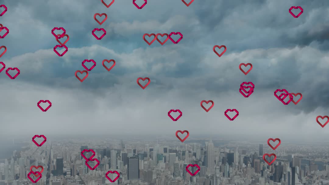 Vibrant metropolis view under dynamic clouds, with animated heart elements enhancing visual storytelling. Ideal for projects involving city life, urban romance, architecture promotions, or animated digital art. Useful for advertisements embracing love and urban themes, or concept visualizations linking emotions with cityscapes.