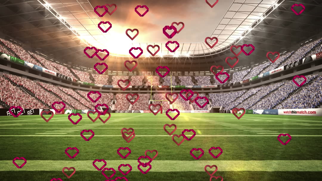 Animation features heart symbols floating across large sports stadium, blending athletic excitement with romance. Useful for digital content related to sports and love, for advertisements promoting romantic sporting events, or creative social media posts conveying love for sports.