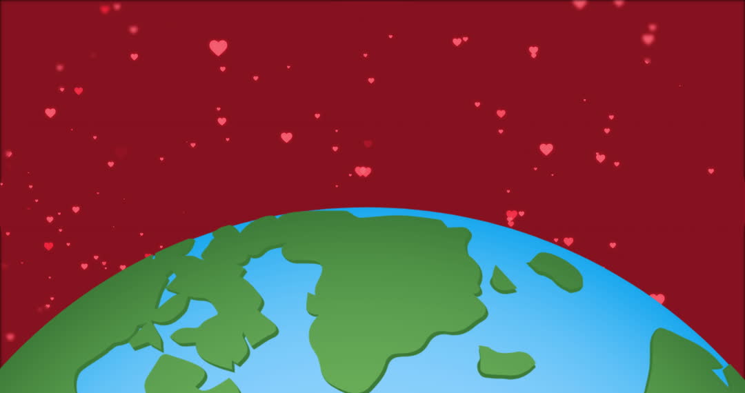 This visual features a globe with animated hearts floating over a red background, symbolizing global love or romance. Ideal for Valentine's Day promotions, romantic greeting cards, international love campaigns, or digital marketing content focusing on relationships. The warm tone and simple graphics convey the theme of universal affection.