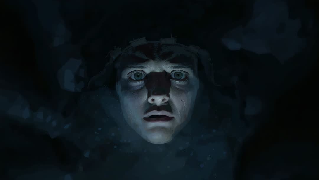 Helmeted Man Staring Up Under Blue Light Breaking Through Shadowy Dust Tense Closeup Video