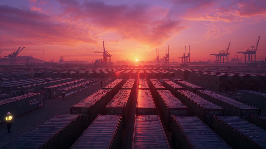 AI Generated Video. Showing hi-vis worker walking between long rows of shipping containers at sunset while cranes silhouetting harbor skyline. Capturing warm golden light, dramatic color contrast, and expansive industrial scale for cinematic storytelling. Ideal for corporate logistics videos, supply chain presentations, safety training modules, maritime industry advertising, and editorial coverage of port operations. Working well as hero footage for landing pages, title sequences, news segments, and social media content. Suggesting slow pan or subtle dolly movement to emphasize depth and rhythm of containers; leaving upper sky area clear for headline text or branding overlay. Noting moody atmosphere and strong silhouette elements useful for conveying efficiency, scale, and end-of-day operations.