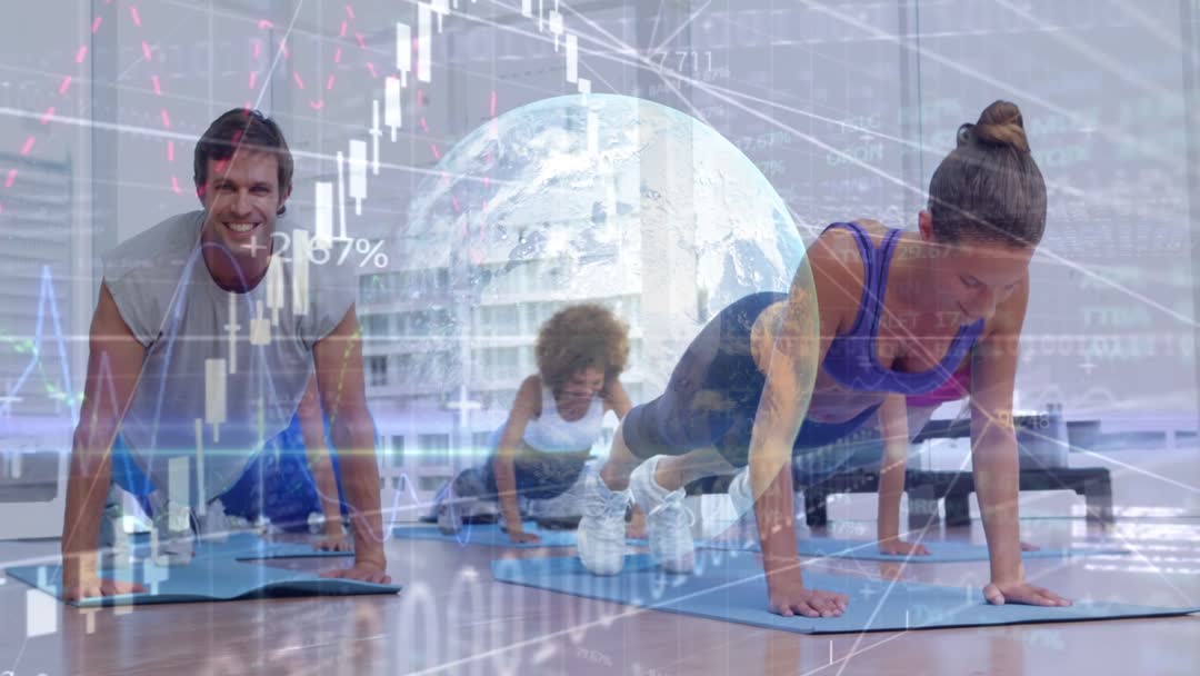 Showing front duo entering plank and doing push-ups on blue mats with cohort following in background, transparent candlestick charts and globe overlays adding data-driven, global context. Featuring cool blue tones, dynamic composition, and focused expressions conveying discipline, stamina, and teamwork. Useful for promoting fitness classes, online training programs, and high-intensity interval workouts; illustrating corporate wellness, employee health initiatives, and team building content; supporting articles and videos about productivity, performance metrics, and work-life balance; enhancing fintech or business campaigns using fitness-as-metaphor for market performance. Working well in website hero banners, social ads, training app intros, presentation slides, and stock footage libraries.