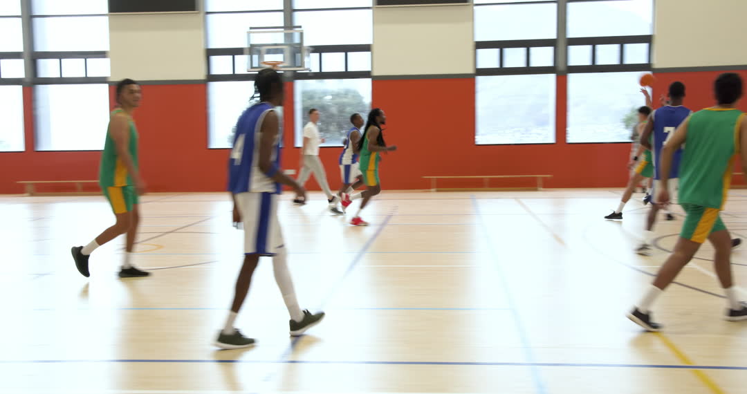 Players in intense basketball game in a school gymnasium, showcasing athleticism and competitive spirit. Ideal for illustrating teamwork, amateur sports, and school competitions in articles, educational materials, or sports pages.