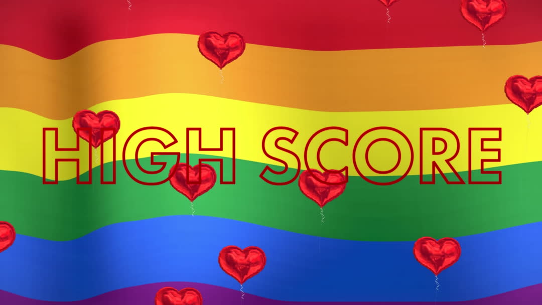 Animated 'High Score' text over vibrant LGBT pride flag background featuring red heart shapes. Suitable for social media, celebrating diversity, inclusivity in digital content, and promotions of LGBT events and pride celebrations.