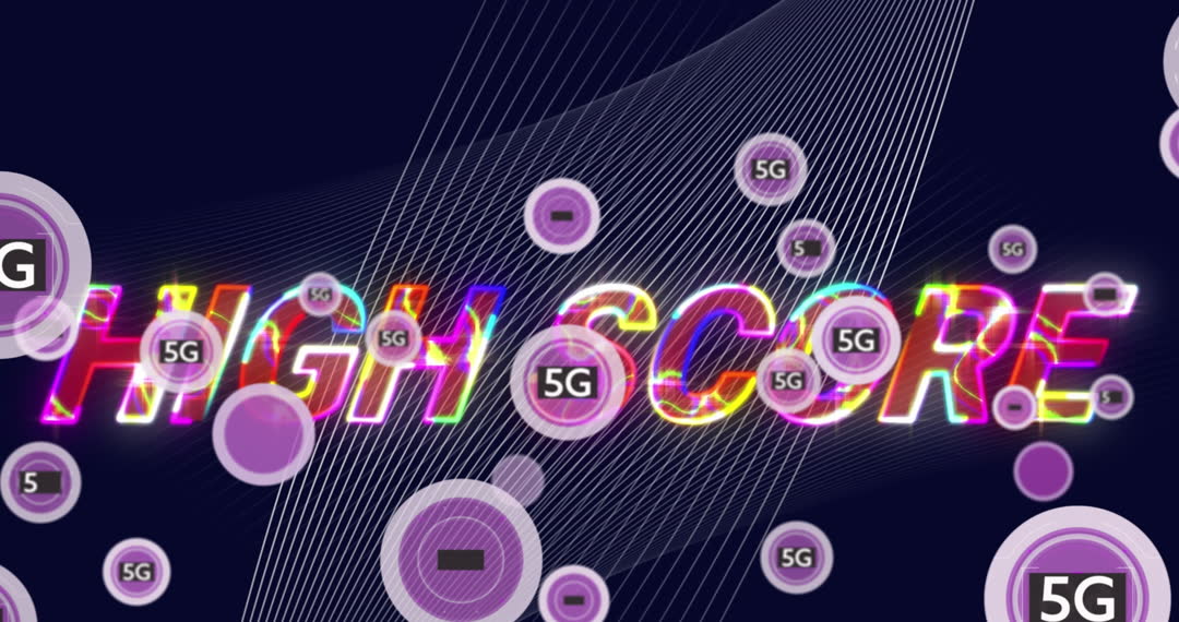Features vivid high score text along with moving digital elements symbolizing 5G technology. Line patterns add modern, dynamic feel. Ideal for use in presentations or projects focused on digital innovations, gaming interfaces, and technology advancements.