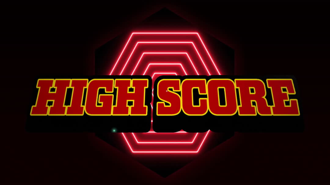 Animation features 'High Score' text illuminated by neon hexagonal shapes against a dark backdrop, reflecting modern gaming aesthetics. Perfect for video game interfaces, digital displays, and electronic sports presentations.