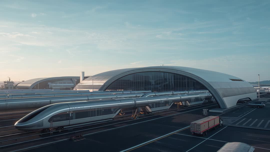 AI Generated Video. Video frame showing high-speed bullet train gliding into futuristic arched terminal under soft sunrise light. Composition featuring sleek aerodynamic locomotive, long glazed platforms, parked cargo truck on apron. Visual mood combining cinematic calm with advanced mobility themes, color palette leaning cool blues with warm sunrise highlights. Useful for transport technology campaigns, architecture and infrastructure presentations, editorial on future mobility, corporate reports on logistics, background for websites and hero banners. Working well for widescreen video edits, motion graphics, print layouts needing modern transit visuals. Usage tips: pair with bold sans-serif headlines, apply subtle motion blur to emphasize speed, crop left to create text space, color grade for warmer or cooler tone depending on campaign.