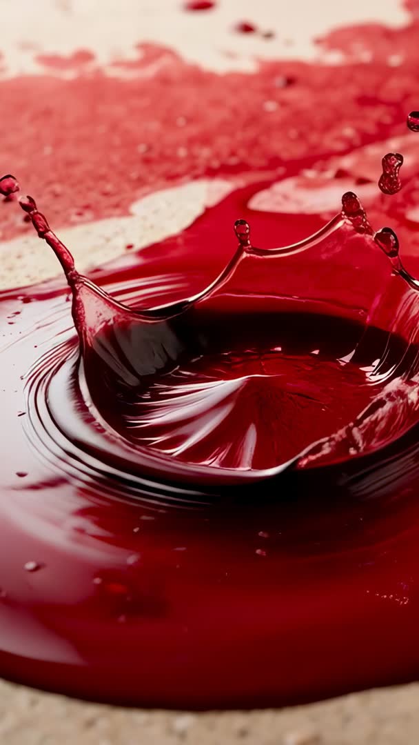 AI Generated Video. Footage capturing high-speed vertical sequence of red liquid droplet impact forming crown-shaped splash on beige tabletop. Macro lens revealing fine details of crown rim, jets and satellite droplets with shallow depth of field isolating motion against soft background. Camera freezing motion to expose surface tension, ripples and fluid dynamics in dramatic detail. Lighting highlighting glossy texture and rich red tones. Serving scientific demonstrations, educational videos on fluid behavior, motion graphics, commercial spots for beauty or beverage concepts, social media reels, smartphone wallpapers, background loops and texture overlays. Providing close-up material for title sequences, abstract art projects, packaging concepts and advertising campaigns. Allowing slow-motion playback and color grading for creative use, with vertical orientation and high frame rate suiting mobile-first platforms.