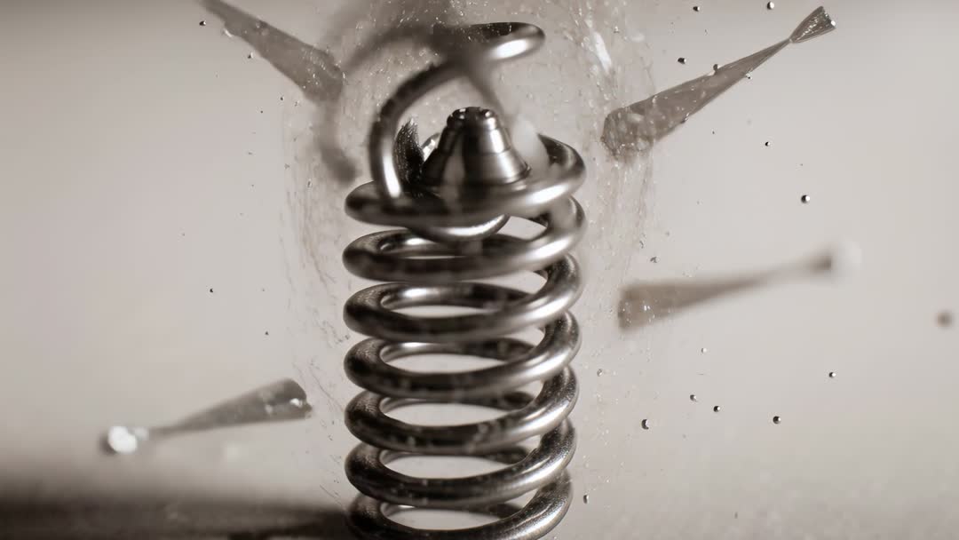 - High-Speed Macro Video Showing Droplet Hitting Metal Compression Spring Creating Crown Splash