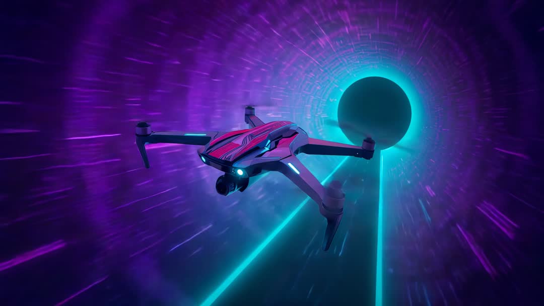 AI Generated Image. Close-up footage showcasing neon-lit quadcopter racing through swirling cyberpunk tunnel toward pulsing cyan orb gateway. High-speed motion blur and vivid magenta-cyan palette evoking futuristic, arcade, and synthwave aesthetics. Scene working well for tech promo openers, esports and drone racing trailers, gaming stream intros, and sci-fi short film sequences. Ideal for website hero banners, social media ads, product launch videos for drone hardware or software, and concept art presentations. Color grading and motion graphics layers pairing easily for title overlays, lower-thirds, and animated transitions. Licensing recommendations including commercial campaigns, editorial features on future mobility and AI, and background visuals for live events. File suggestions: 4K resolution, loopable clip, and options with transparent background for compositing.