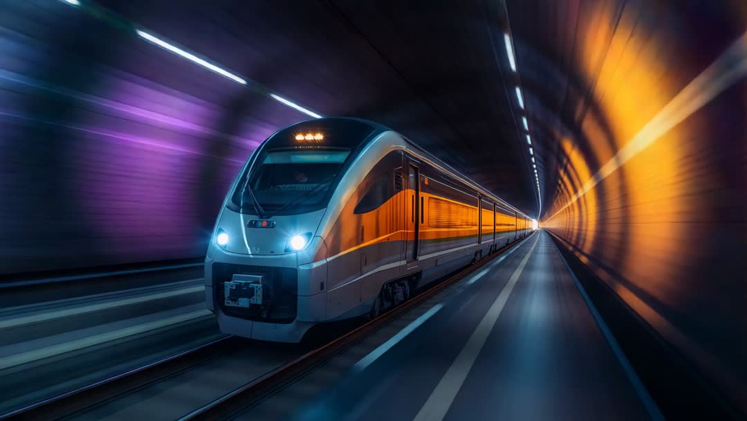 AI Generated Image. Video clip showing high-speed passenger train racing through neon-lit tunnel toward bright exit light. Camera tracking alongside train, creating strong motion blur, leading lines, and dramatic vanishing point. Lighting combining warm orange and cool purple LEDs, producing cinematic contrast and futuristic mood. Frontal perspective highlighting aerodynamic nose, illuminated headlights, reflective carriage surfaces. Useful for transportation advertising, corporate tech promos, infrastructure presentations, transit system launches, sci-fi or futuristic sequences. Ideal for website hero banners, social media videos, commercial spots, documentary segments, background for title sequences. Motion-friendly composition allowing overlay of text, logos, graphical data. Color grade easily adjustable for brand coherence. Shot suitable for campaigns promoting speed, innovation, urban mobility, engineering, sustainable rail solutions.