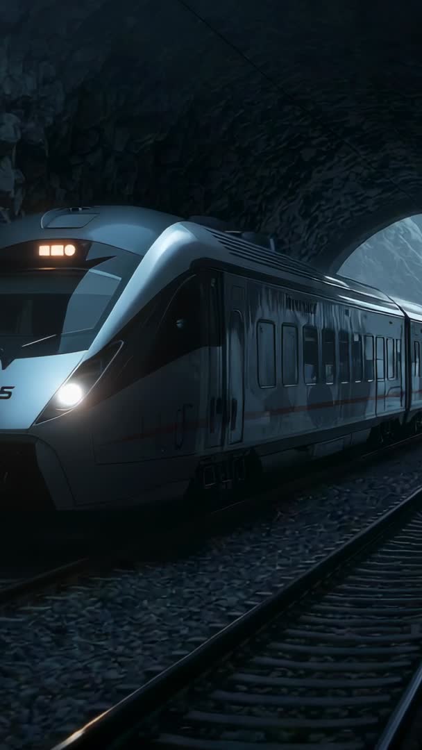 AI Generated Video. Vertical video showing high-speed train emerging from rock tunnel at night, headlights piercing darkness and reflecting on wet metal surfaces. Scene capturing motion and drama with converging tracks guiding viewer toward tunnel exit. Cinematic blue lighting and high contrast conveying suspense and power suitable for transportation campaigns, travel promos, infrastructure presentations, safety announcements, and cinematic trailers. Close-up exterior framing emphasizing locomotive nose and illuminated windows, useful for title cards, social media vertical ads, hero sections on websites, and background for motion graphics. Footage allowing color grading for moody tones or warm film look, permitting slow-motion or speed-ramp edits to emphasize momentum.