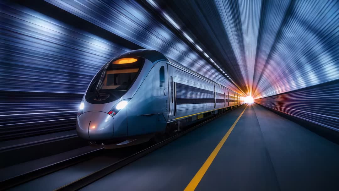 AI Generated Image. Showcasing high-speed train racing through illuminated tunnel with dramatic motion blur and strong vanishing point guiding eye toward sunlit exit. Emphasizing speed, technology, and modern rail infrastructure through bold lighting and streamlined locomotive silhouette. Working well for transport advertising, high-speed rail promotion, transit infrastructure reports, and corporate videos highlighting innovation. Serving as dynamic hero footage for website banners, social media promos, trade show displays, and cinematic openers. Allowing color grading for futuristic feel or converting to black-and-white for editorial use. Supplying ample negative space along platform and tunnel walls for overlaying text, logos, or motion graphics. Providing compatible aspect ratios for widescreen video projects and high-resolution still extraction for print use.
