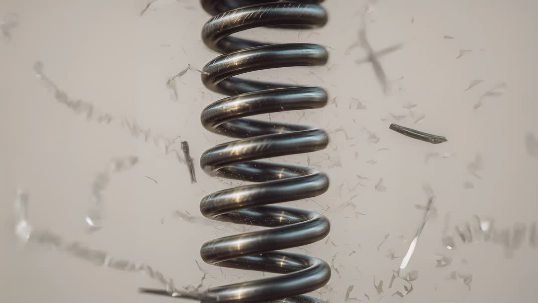 AI Generated Image. Closeup high-speed video showing steel coil spring ejecting metal shavings, ribbons and fragments after impact. Neutral pale background isolating subject and emphasizing reflective metal texture and spiral geometry. Tight framing capturing dynamic motion, airborne particles and micro debris for scientific or industrial analysis. Ideal for manufacturing imagery, machining and metalworking tutorials, engineering presentations, safety and hazard awareness campaigns, and product advertising for tools or springs. Useful for visual effects, motion design, and cutaway sequences where dramatic metal particles enhance storytelling. Recommend using slow-motion playback, macro cropping, and contrast boosting to highlight surface details, particle trajectories, and impact dynamics.