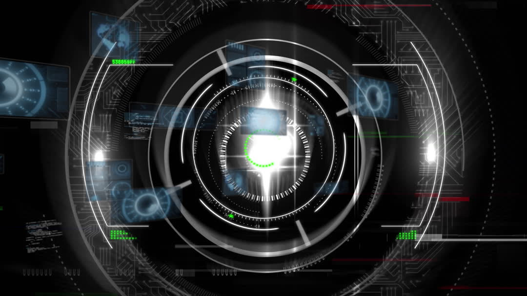 Futuristic digital animation depicting an interface with scopes scanning over data amid a dark background suggests cutting-edge technology and global network connectivity. This animation reflects cybersecurity concepts, data processing, and high-tech environments. Ideal for technology websites, futuristic video productions, or educational purposes related to digital data management and analysis.