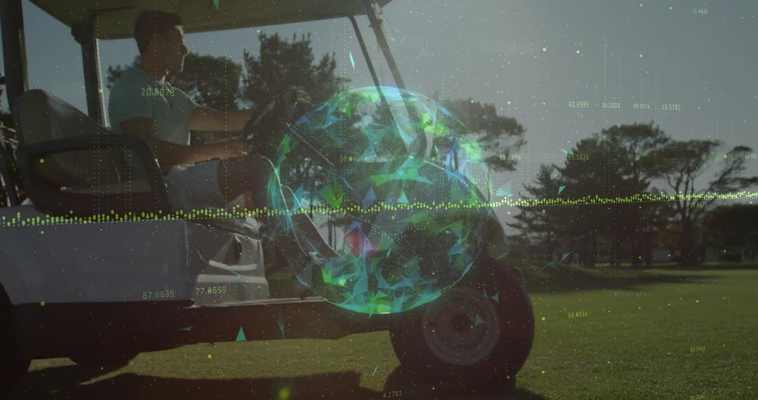 This segment captures a modern golfer driving across a sunrise-lit golf course, accompanied by an advanced tech visualization depicting floating data analyses. Ideal for showcasing technological innovations in sports, enhancing user experiences, portraying outdoor leisure activities, and targeting golf enthusiasts interested in technology.