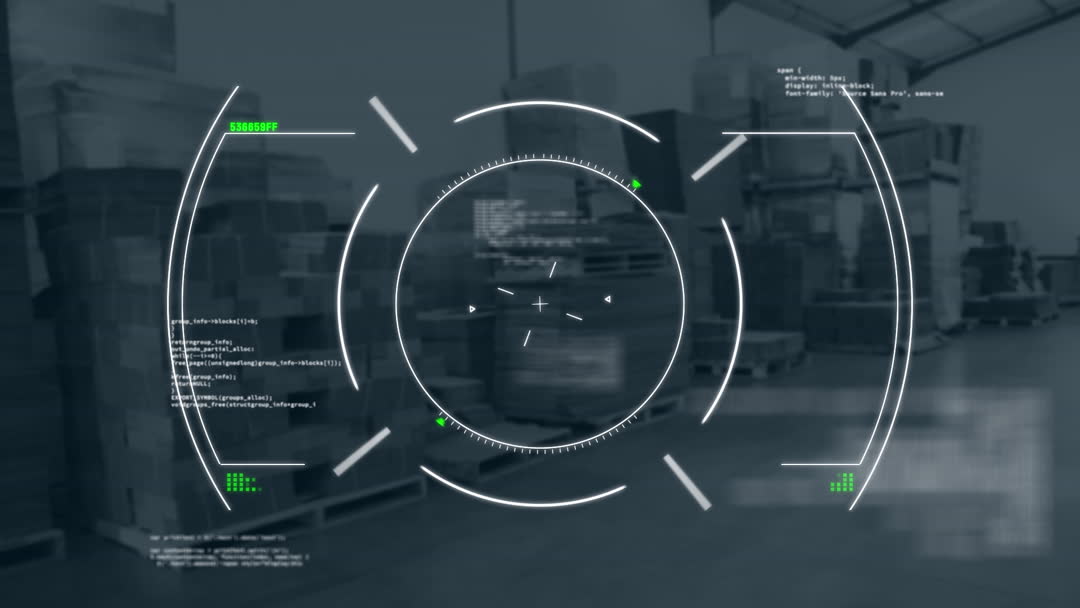 Scope scan overlay represents sophisticated data processing interfacing with warehouse operations, embodying concepts of logistics and automation technology. Ideal for illustrating advancements in warehouse management, digital transformation, and technology’s role in modern logistics systems. Useful for articles, presentations, and media focused on high-tech business solutions.