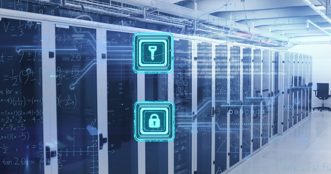 Image depicts server racks in data center overlaid with digital visualization of encryption icons and data processing symbols, suggesting advanced cybersecurity concepts. Ideal for illustrating data protection, IT infrastructure, cloud services, and system security topics in presentations and marketing materials.