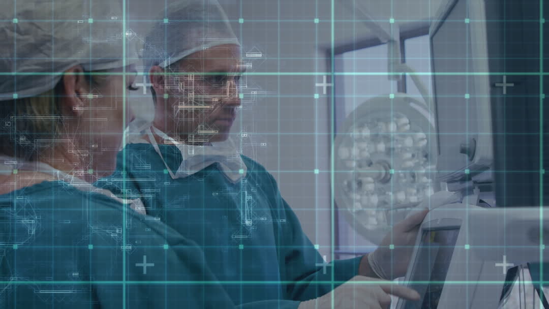 Image shows medical professionals in surgical attire interacting with advanced digital technology during a procedure, reflecting the integration of data interface in modern medicine. Useful for illustrating themes of medical advancement, healthtech innovations, and the use of global data in surgical practice.