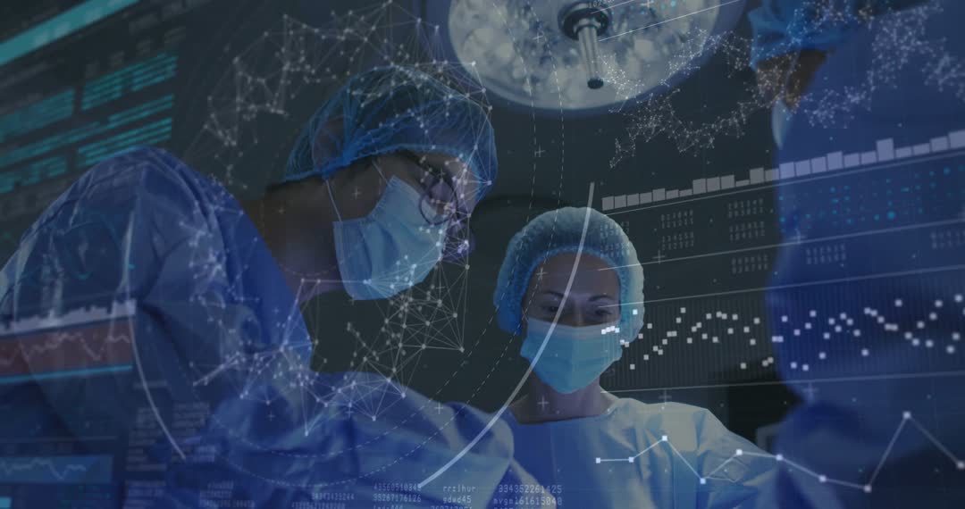 Surgeons performing a medical procedure with technology overlay showcasing patient vitals and advanced data analytics. Ideal for illustrating innovations in healthcare technology, promoting medical seminars, and boosting grants for medical research and development advocacy.