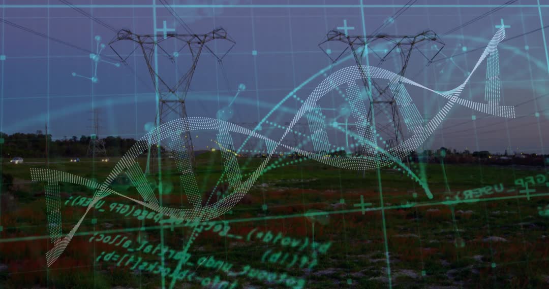 This scene highlights the conjunction of technology and nature, featuring a rural landscape at dusk with high-voltage transmission towers. An overlay of network nodes and waveforms suggests connectivity and advanced technology. Useful for content illustrating themes of energy infrastructure, sustainable development, digital transformation, or futuristic environments. Applicable in industry reports, technology presentations, or educational materials regarding energy systems.