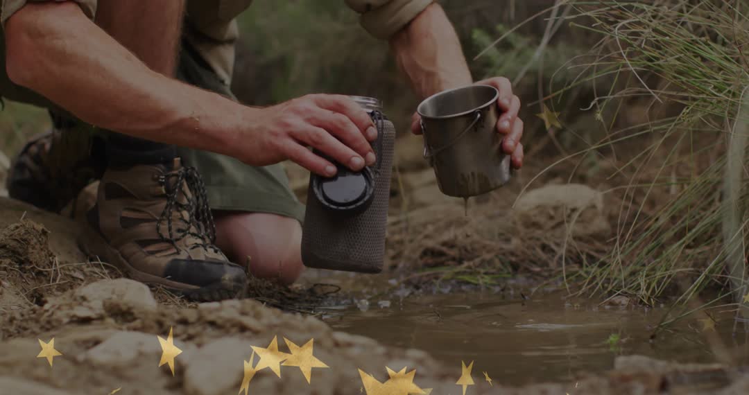 - Hiker Collecting Water from Stream with Metal Cup
