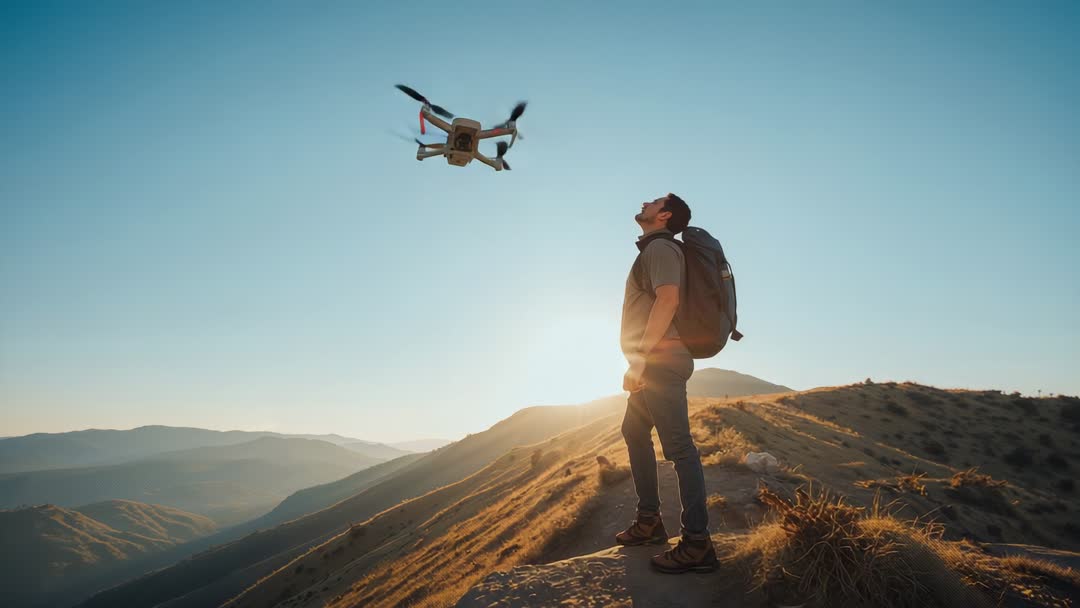 AI Generated Video. Male hiker standing on sunlit mountain ridge, monitoring drone hovering nearby during golden hour. Frame capturing warm backlight, long shadows, and layered mountain ranges receding into distance. Composition balancing human element and aerial technology, conveying exploration, adventure, and modern outdoor innovation. Working well for travel and outdoor gear marketing, drone technology promotion, adventure tourism campaigns, editorial stories about UAV and outdoor recreation, social media hero banners, website headers, and documentary footage. Technical highlights include landscape orientation, wide sky copy space for text overlay, golden hour color palette, sharp foreground subject with soft atmospheric background.