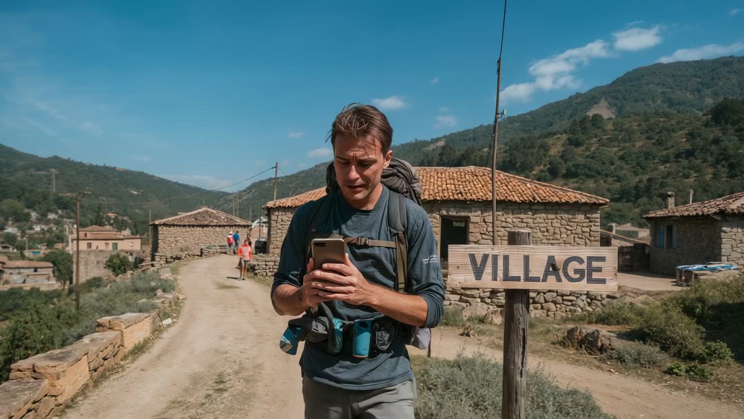AI Generated Image. Video showing hiker navigating smartphone while walking along dirt road past wooden sign reading VILLAGE and rustic stone houses. Featuring backpack loaded with gear, clear blue sky, rolling hills and distant rooftops for strong travel narrative. Conveying contrast between modern navigation technology and traditional rural life, offering authentic storytelling opportunities for travel and tech content. Suiting travel blogs, tourism websites, navigation app demos, outdoor gear campaigns, trekking guide videos and social media reels. Supporting editorial use for hero clips, background footage, promotional banners and split-screen sequences. Allowing easy editing by adding animated route overlay, lower third text, map pop-up or animated pin to emphasize navigation theme. Including voiceover narration about hiking tips, local culture or route guidance to boost engagement. Offering flexible color grading options such as warm film look or natural tones to match brand aesthetic.