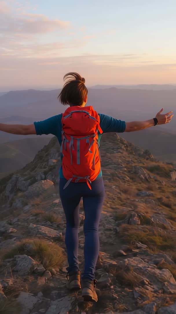 AI Generated Image. Vertical video showing back view of hiker walking narrow mountain ridge at sunset, arms outstretched and hair catching breeze. Red backpack creating strong focal point against warm golden light and layered mountain silhouettes. Wide horizon and soft pastel sky leaving ample space for on-screen text and lower-third graphics. Vertical format optimizing mobile viewing and social platforms, fitting Instagram Reels, TikTok, Stories. Suiting travel vlog intros, outdoor gear promotions, tourism campaigns, wellness and mindfulness content, inspirational storytelling. Conveying freedom, solitude, triumph, connection with nature while maintaining cinematic atmosphere. Suggesting uses for background title overlays, voiceover narration, slow-motion reveal, inspirational quote cards and app hero clips. Licensing flexibility supporting commercial and editorial use, appealing to outdoor brands, travel agencies, fitness apps, and editorial features about hiking and adventure.