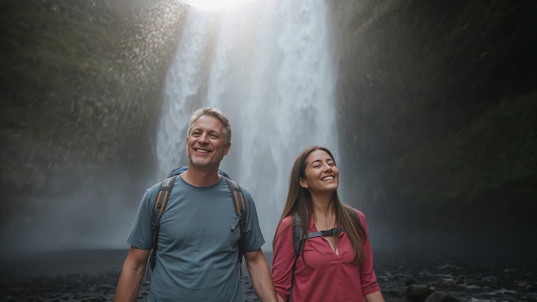 AI Generated Video. Couple hiking and holding hands while walking toward powerful waterfall with sunlight streaming through misty gorge. Filming in cinematic slow motion, footage capturing joyful expressions, natural backlight, and dramatic water curtain. Scene working well for travel vlog openers, tourism commercials, adventure lifestyle campaigns, romantic getaway promos, wellness and mindfulness content, environmental conservation features. Useful for hero banners, social media reels, website headers, documentary sequences, background footage for outdoor and travel brands. Postproduction suggestions: enhancing warm highlights on faces, retaining cool tones in water and rock, adding gentle slow motion and subtle vignette for immersive mood. Composition leaving negative space on right side near dark rock wall for overlaying titles or lower third graphics. Color palette offering contrast between warm skin tones and cool blue-gray water and mist. Ideal for campaigns promoting ecotourism, couples retreats, active travel packages, hiking gear, and sustainable tourism storytelling.