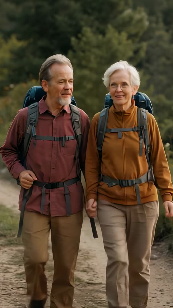 AI Generated Video. Video showing senior couple hiking hand-in-hand along forest trail while camera slowly zooming in. Shot in vertical format for mobile viewing, featuring backpacks, outdoor jackets, natural warm light and soft background bokeh. Duo portraying companionship, active retirement, healthy aging and gentle adventure. Useful for travel promotions, outdoor gear ads, wellness campaigns, retirement planning content, social media reels and tourism websites. Recommended uses include hero clip for landing pages, Instagram reels, Facebook ads, mobile-first video ads, lifestyle blog headers and senior living brochures.