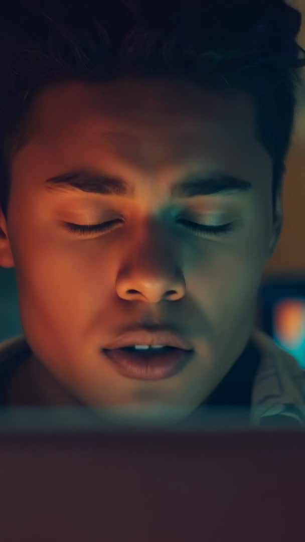 AI Generated Image. Close-up vertical video showing Hispanic young man rubbing eyes while staring at laptop screen under moody blue-orange light. Scene conveying fatigue, eye strain, concentration, late-night work habits, and digital overload. Lighting and shallow depth of field creating cinematic, intimate mood for storytelling. Content suiting mental health articles, tech ads promoting blue-light filters, workplace wellbeing campaigns, sleep hygiene tips, productivity blog posts, and social media reels about remote work burnout. Recommending adding captions, subtitles, or voiceover for vertical platforms. Considering overlaying statistics, call-to-action buttons, or product shots for advertising. Serving as website hero loop, in-app onboarding clip, Instagram Reels, TikTok clip, or health awareness spot.
