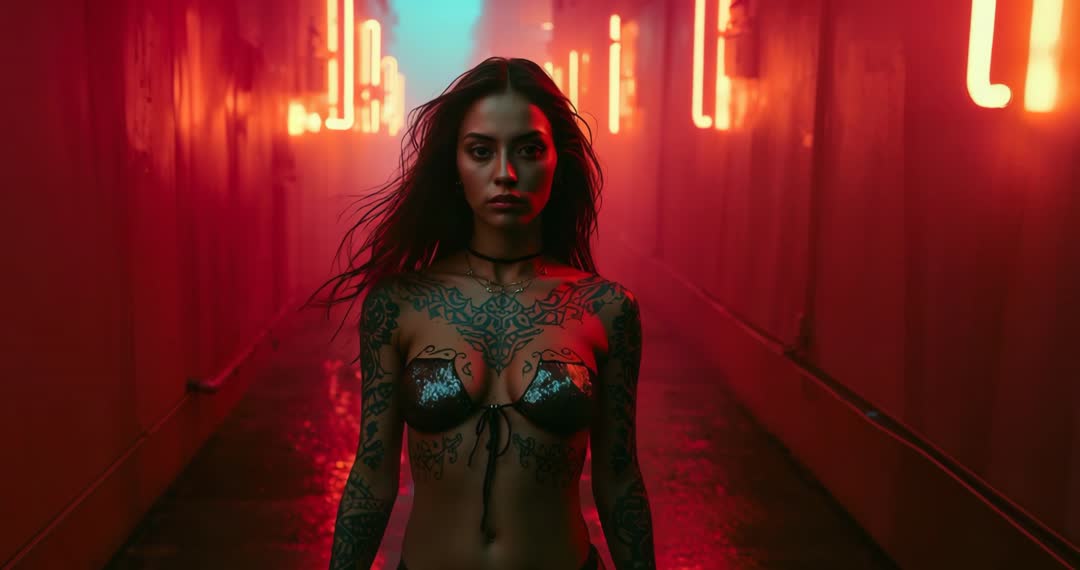 AI Generated Video. Captivating scene showing a Hispanic model walking through a neon-lit urban corridor. She wears a metal bikini top enhancing bold tattoos, adding an edgy vibe. Suitable for promoting fashion brands, urban nightlife editorials, and creative projects highlighting contemporary glamour.