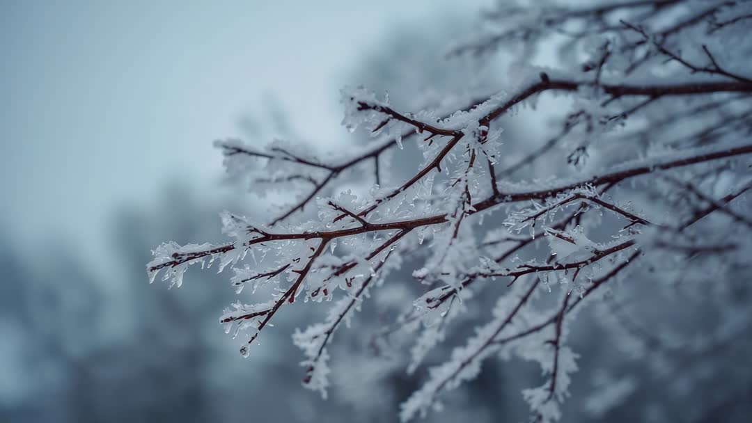 AI Generated Video. Showing hoarfrost coating bare branch at woods edge with fine ice droplets forming delicate crystalline needles against soft out-of-focus forest backdrop. Highlighting intricate texture of ice and angular silhouette of thin twig, with cool blue tones creating quiet, chilly mood. Evoking early-morning frost, seasonal change, and winter stillness for editorial and commercial use. Providing high-contrast focal area and generous negative space on left side for overlaying text, logos, or headlines. Suiting winter marketing, nature editorials, seasonal greeting cards, social media banners, website hero graphics, calendar spreads, packaging for cold-weather products, and environmental storytelling. Suggesting cropping for banner ratios, increasing contrast for editorial print, or using soft vignette to enhance mood and focus on crystalline details.
