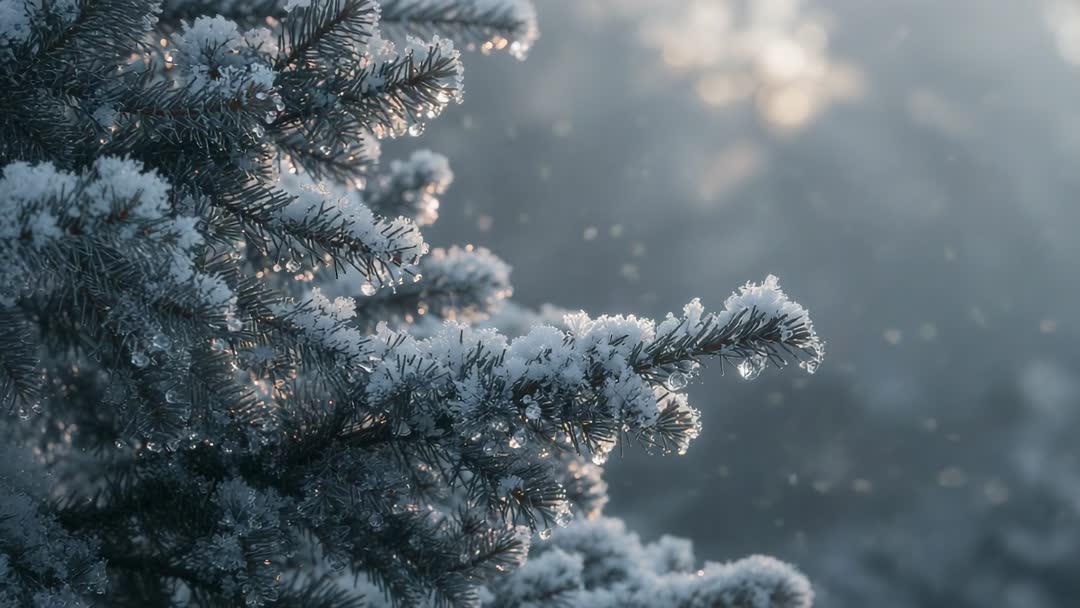 AI Generated Video. Close-up slow-motion footage showing hoarfrost-covered conifer branch catching soft morning sunlight and releasing melting droplets that sparkle on needle tips and fall into bokeh-filled background. Featuring cool blue tones, crisp ice crystals, and gentle backlight creating serene winter mood. Use for website hero banners, social media reels, seasonal advertising, holiday greeting visuals, nature documentaries, environmental campaigns, wellness and meditation backgrounds, desktop wallpapers. Suggest cropping for widescreen or vertical formats, adding slow zoom or subtle parallax, looping for ambient background, and color grading warmer tones for festive projects.