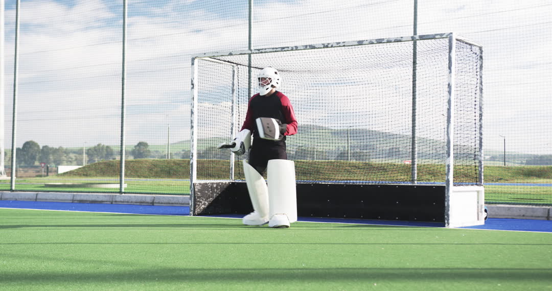 Hockey goalie standing ready on green turf field, wearing complete protective gear. Clear blue sky and distant hills enhance the open field setting. Athlete demonstrates focus and readiness, highlighting determination and sports competition. Useful for sports advertisements, goalie equipment promotions, and articles on athletic dedication.