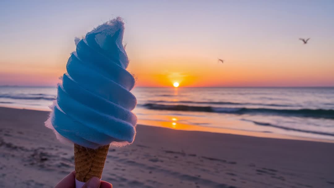 AI Generated Image. Showing close-up of hand holding blue soft-serve cone while sun lowering over ocean horizon. Featuring swirl texture and cotton-candy fluff contrasting with warm orange reflection on water. Capturing seabirds flying and waves rolling, adding peaceful coastal motion and relaxed summer mood. Providing versatile clip for summer marketing, dessert branding, travel vlogs, social media reels, lifestyle commercials, cafe menus, hero banners, and event promotions. Allowing easy editing for slow-motion reveal, color grading to boost warm highlights, overlay text placement in sky area, and loopable sequence for background video or animated headers.