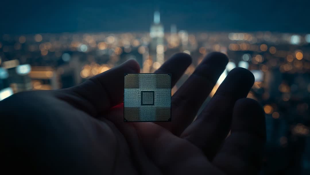 AI Generated Image. Footage showing adult hand holding microchip above city skyline at night, chip pulsing with soft glow against bokeh lights. Cinematic low-light look and shallow depth of field creating dramatic focus on silicon die, hand and dark sleeve framing subject. Suiting tech startup promo, AI and semiconductor presentations, futurism videos, product reveal, commercial spots, website hero banners, and editorial tech coverage. Providing room for text or logo overlay in upper-left or lower-right areas with bokeh providing natural contrast. Recommending cool blue color grade, subtle ambient soundtrack, and slow push-in for cinematic impact. Working well as background for stories about edge computing, machine learning, chip manufacturing, and urban innovation.