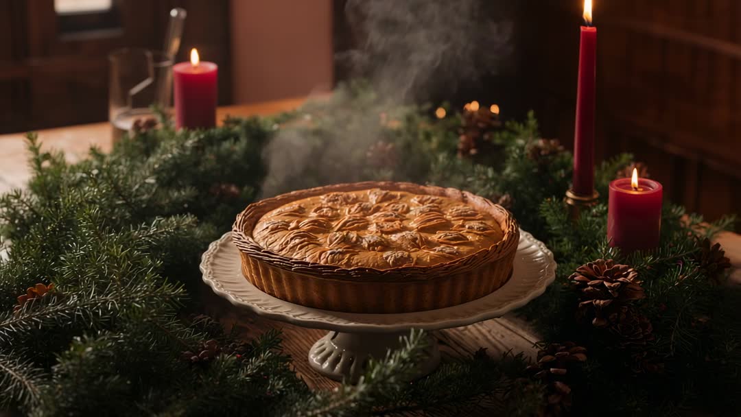 AI Generated Image. Streaming steam rises from fruit pie placed on pedestal, flanked by wreath and lit candles. Ideal for promoting holiday events, festive baking guides, or rustic dining experiences. Evokes warmth and celebration perfect for seasonal campaigns.