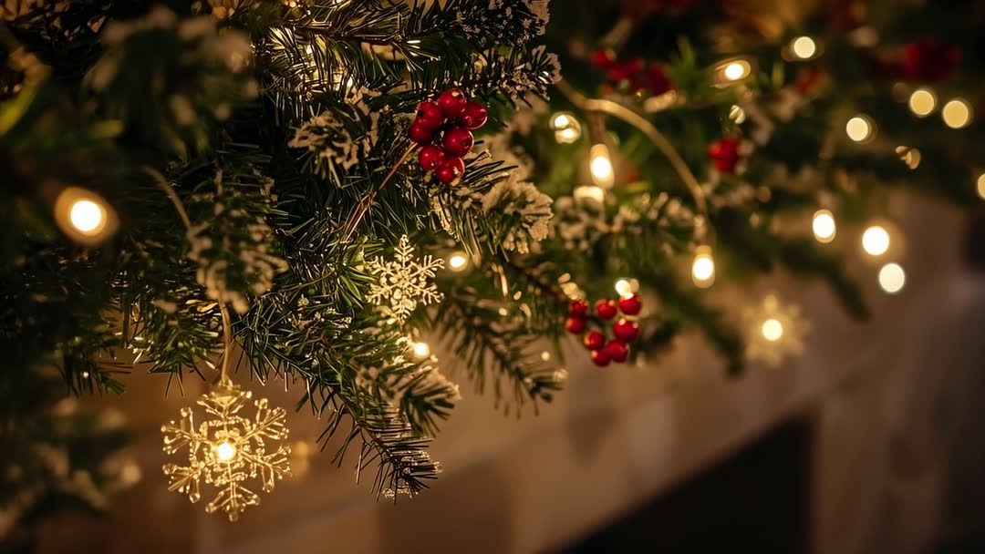 AI Generated Video. Video showing close-up of holiday garland glowing on mantel, featuring illuminated snowflake ornament, red berry clusters, frosted pine needles, warm twinkling lights and soft bokeh. Mood conveying cozy festive atmosphere, holiday warmth and intimate interior ambiance. Featuring shallow depth of field, close-up composition, soft bokeh highlights and warm golden tones. Highlighting warm gold tones, deep green foliage and vibrant red accents for seasonal color palette. Working well for website banners, holiday advertising, social media hero images, greeting card animations, retail seasonal campaigns, interior design portfolios, event invitations and commercial b-roll. Providing easy space for text overlay and logo placement during video editing or motion graphics. Ideal for festive storytelling, product showcase backdrops, seasonal newsletter headers and mood-driven brand content.