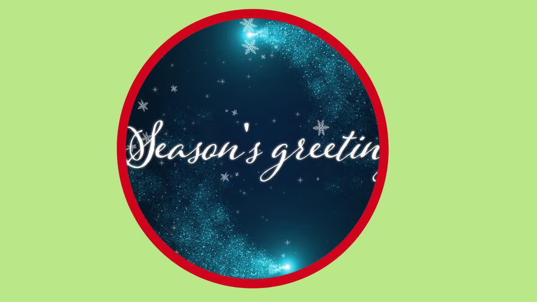 Festive digital animation displaying 'Season's Greetings' with gentle snowfall creating a warm holiday atmosphere. Useful for digital holiday cards, email templates, festive invitations, and social media posts.