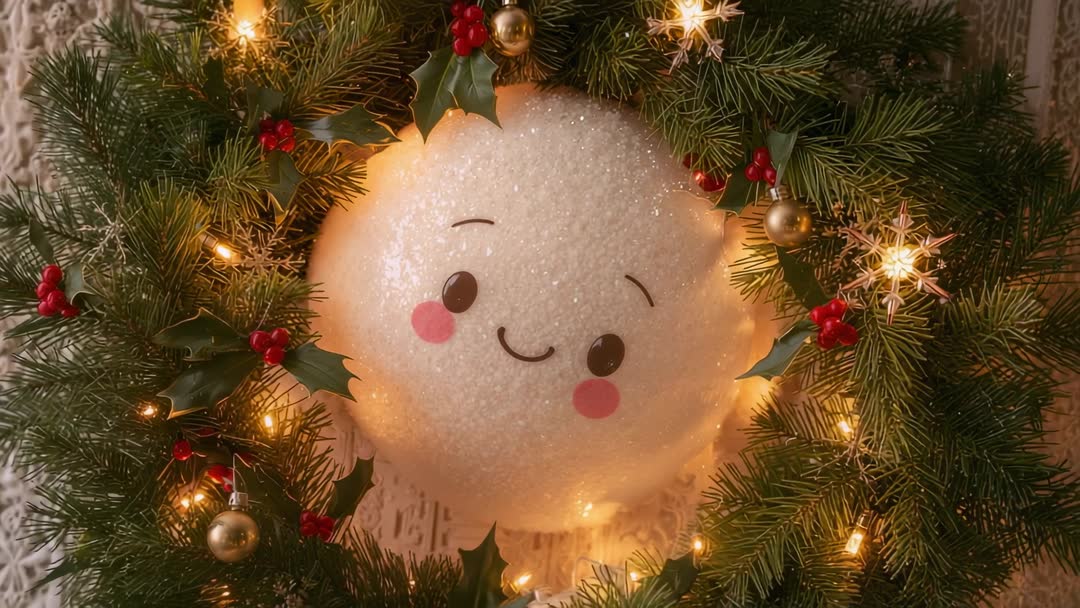 AI Generated Video. Featuring smiling plush ornament nestled in evergreen wreath, tilting gently while warm fairy lights pulsing and star lights twinkling. Soft knitted backdrop adding cozy texture while holly berries and gold baubles provide festive accents. Ideal for holiday video loops, social media reels, seasonal product promos, greeting card animations, website hero banners, in-store displays, and DIY craft tutorials. Use as background for family holiday messages, cozy home decor inspiration, Christmas event invites, or retail advertising. Clip delivering warm, joyful mood and slow-motion charm for seasonal campaigns and festive storytelling.