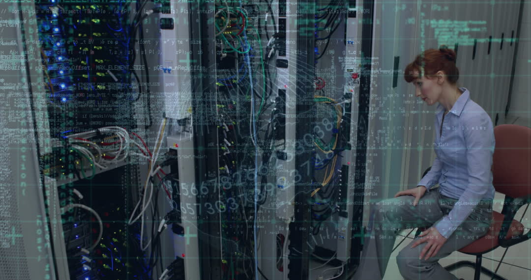 Depicting a high-tech fusion of data visualization and a server room, holographic financial data and digital codes overlay on a woman diligentely working near server equipment submenu data annotations being activated have futuristic technology implications how innovation, integration offer modern approaches educate technology realms impactful visuals great for utilizing theme tech advancement promotions futuristic digital designs promotions infographics updates positive depictions excellent perfect addition conveying concepts themes futuristic technology practical applications enterprises setting financial data processing security.