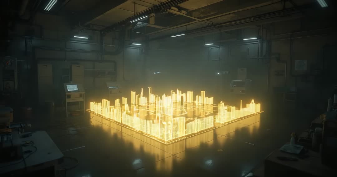 Holographic City Model Lighting Up in Industrial Workshop Video