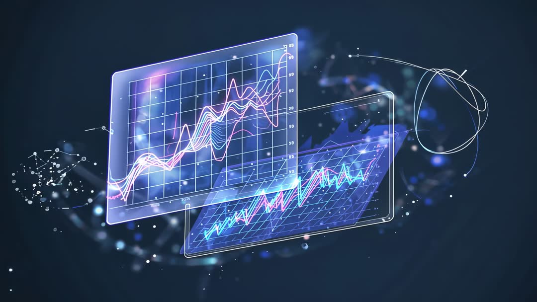 AI Generated Image. Video clip showing holographic panels rising and tilting over neon grid while multi-colored line charts are animating across transparent screens. Pulsing particle trails and connecting nodes accentuating data flow, creating dynamic futuristic atmosphere suitable for technology and finance presentations. Use for fintech promos, stock market reports, startup pitch decks, website hero banners, broadcast graphics, or social media campaigns. Loopable motion working well for background animation in videos and slides, and for overlaying data labels or subtle branding. Color palette featuring electric blue, cyan, magenta, soft pink glow, and deep navy backdrop, delivering high-contrast cinematic look for modern digital storytelling.